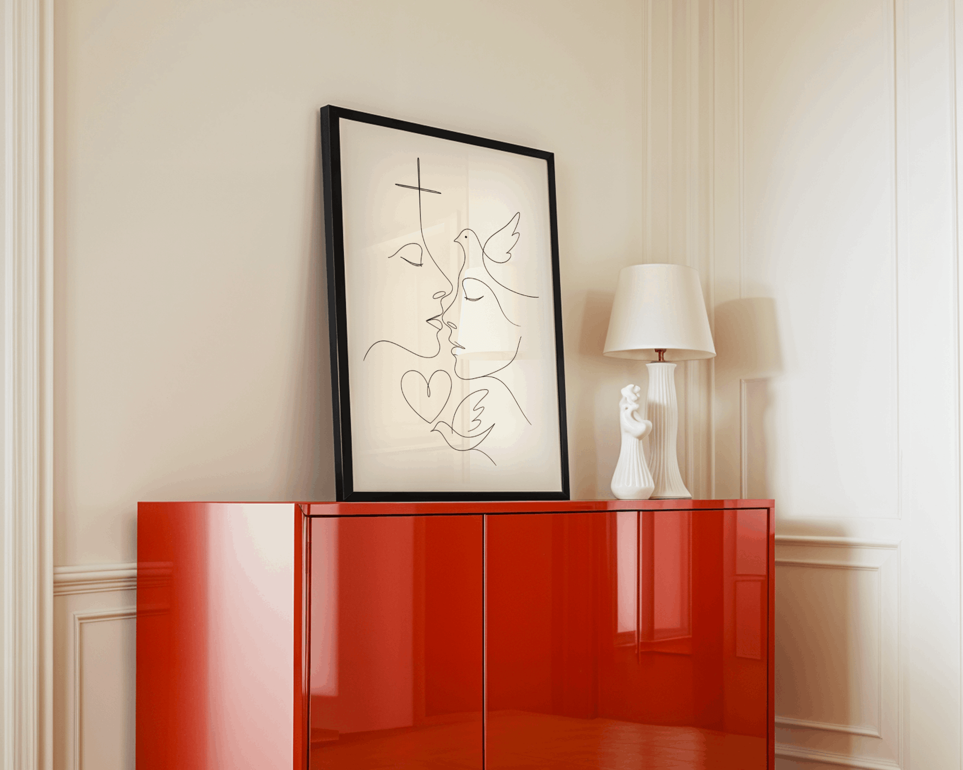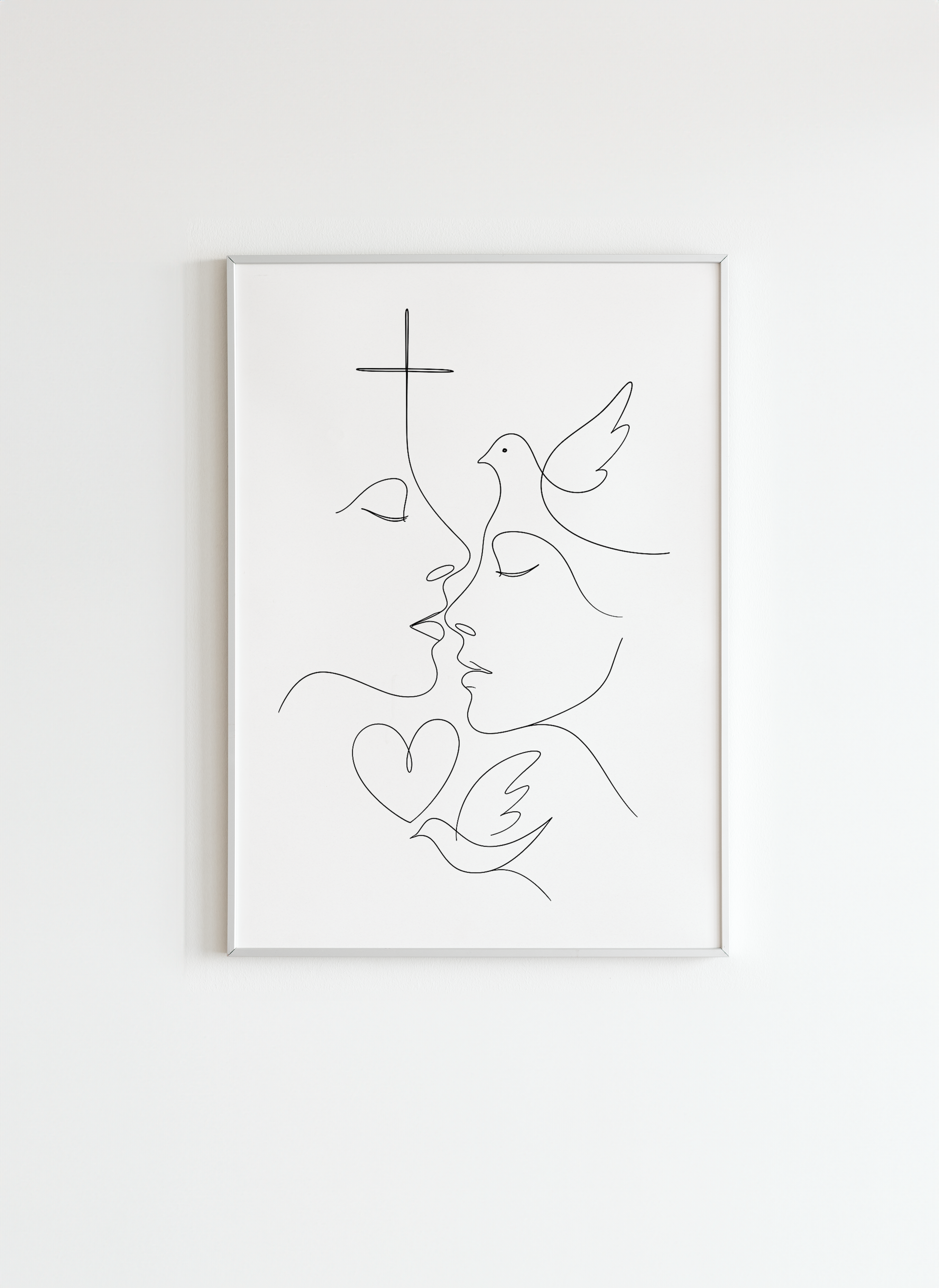A modern and minimalist line art illustration combining two serene faces, a cross, doves, and a heart. This spiritual artwork symbolizes love, unity, and divine peace. Perfect for contemporary Christian home decor, prayer rooms, or as a meaningful gift.