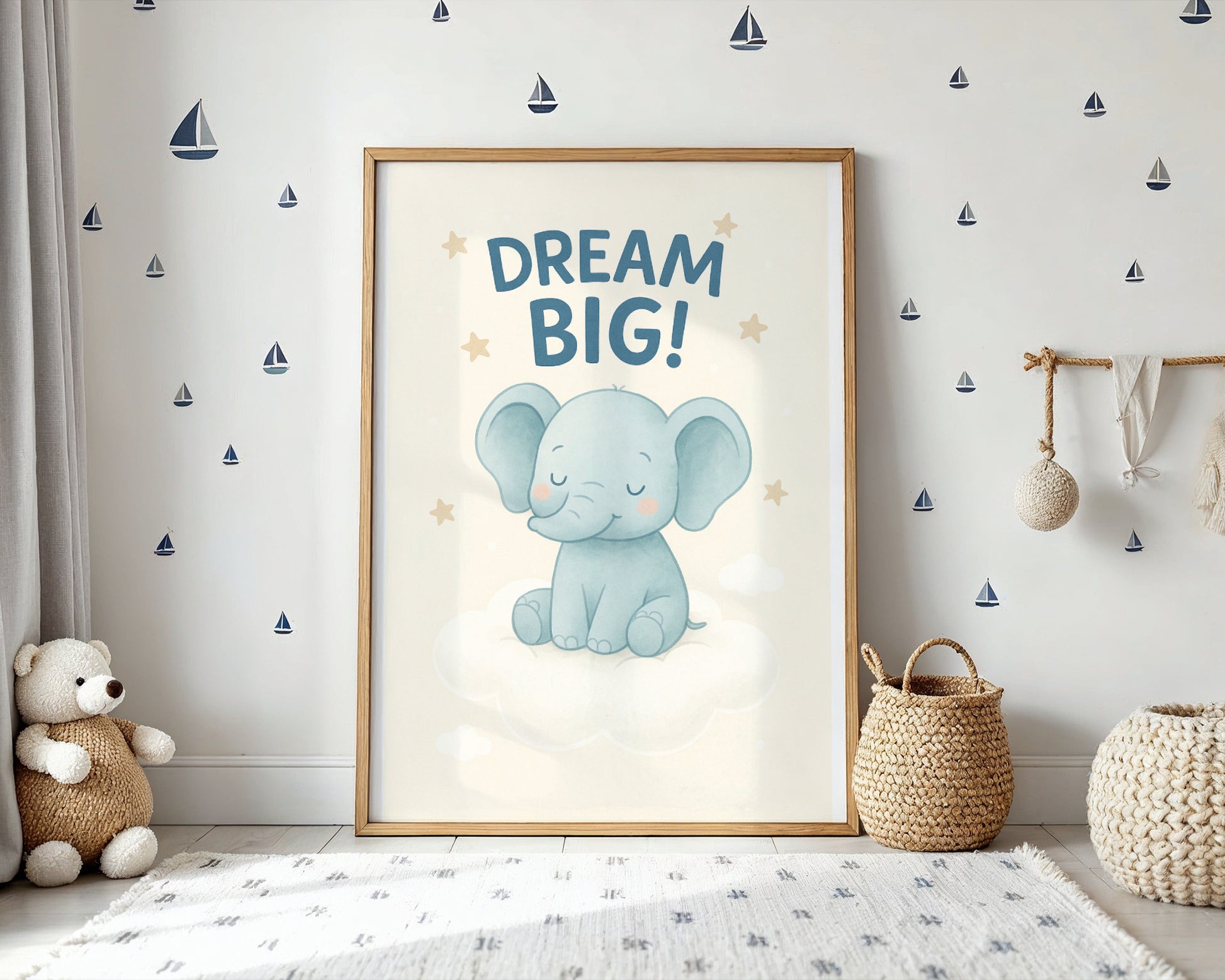 Encourage little ones to dream big with this sweet elephant poster. Its soft pastel colors and playful design make it a perfect decoration for nurseries, kids’ rooms, or as a thoughtful baby shower gift.