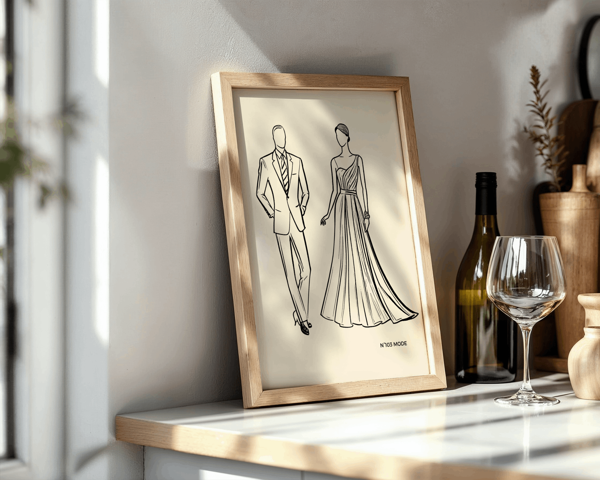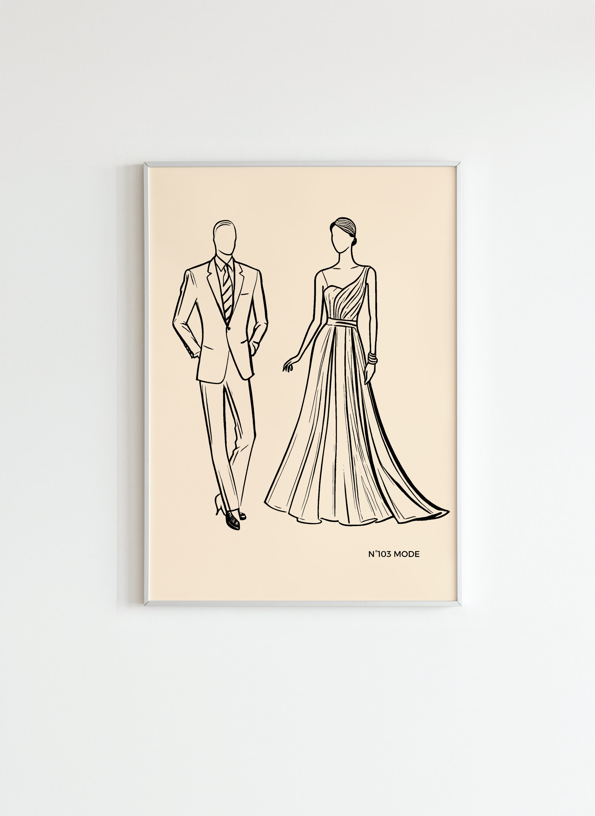 A timeless black-and-white fashion sketch featuring an elegant man in a suit and a woman in a glamorous evening gown. This chic illustration adds sophistication to any interior and is ideal for fashion lovers, designers, or as wall decor in studios, boutiques, or stylish homes.